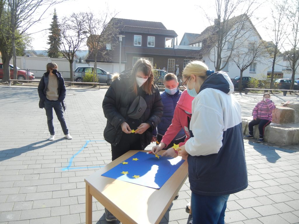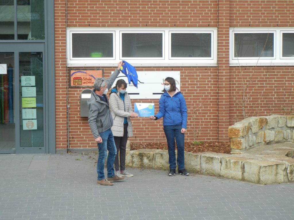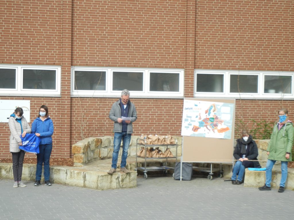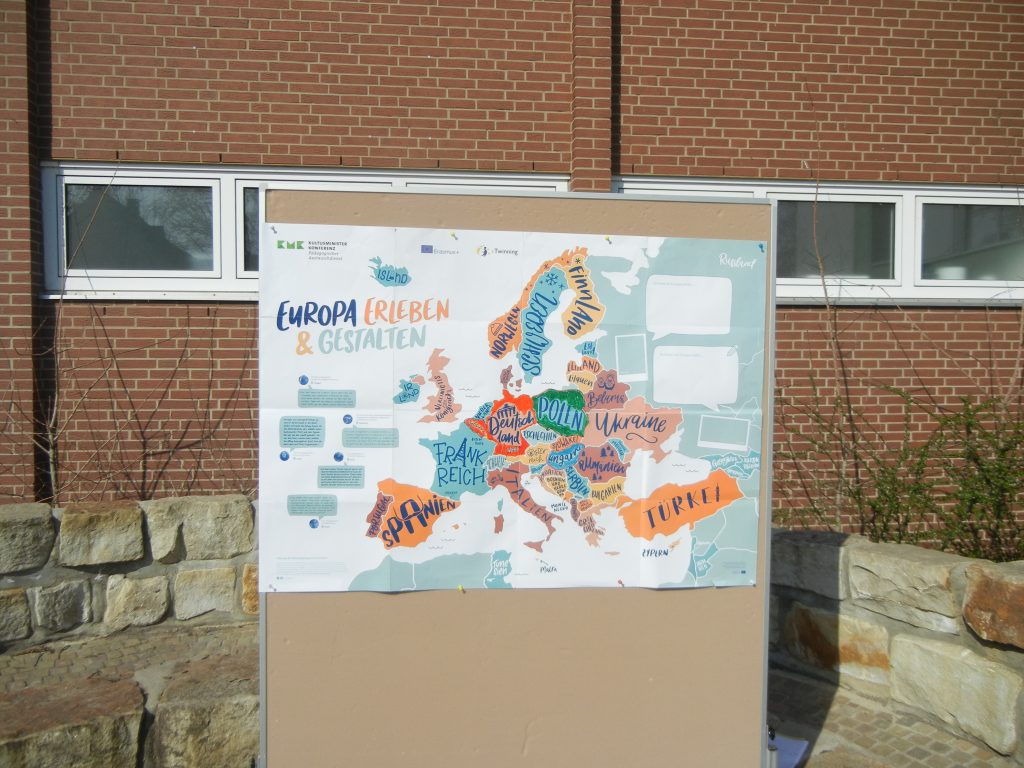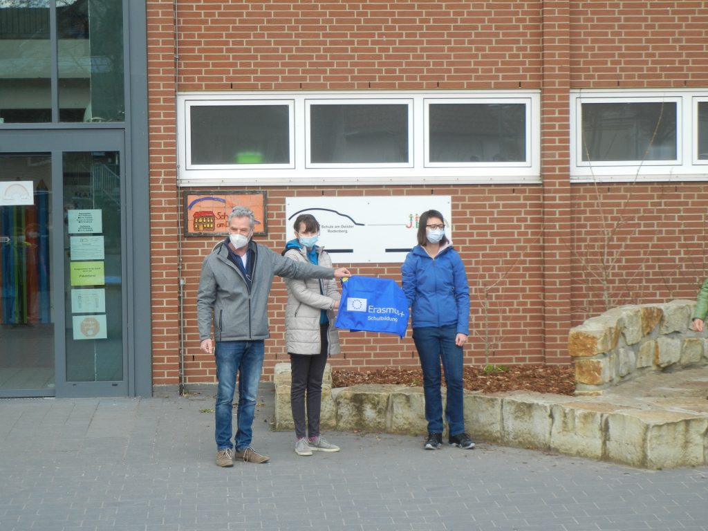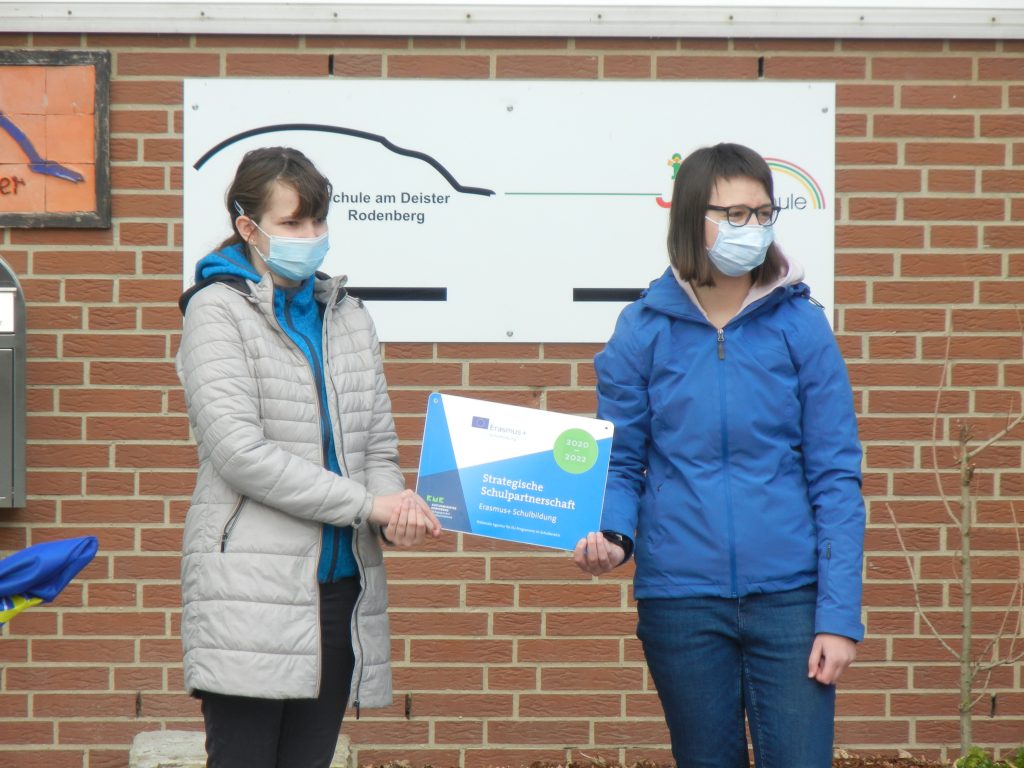 Wir haben daher eine Tafel erhalten, auf der die Schulpartnerschaft offiziell bestätigt wird. Diese hängt nun im Eingang unserer Schule. Wir haben sie feierlich enthüllt bei einer Veranstaltung auf dem Schulhof am 16.04. und 23.04.2021. Coronabedingt standen alle Klassen in festgelegten Kästchen mit Abstand voneinander. Die Presse war eigeladen, unser Schulleiter Herr Oelke hat eine Rede gehalten, Frau Carstensen hat erzählt, was unsere Schule schon alles an Aktivitäten vom Projekt Erasmus+ gemacht hat (Weihnachtkarten geschickt, Ostervideos gedreht, Europaquiz geraten, Geschenke aus Belgien, Ungarn und Polen vor Weihnachten). Leider durften wir ja bisher noch nicht reisen.