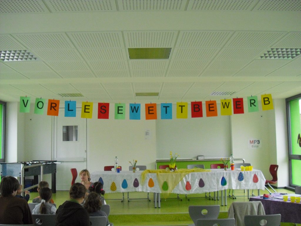 In jedem Jahr gibt es einen Vorlesewettbewerb an unserer Schule. Eine Woche lang lesen Schülerinnen und Schüler aus allen Jahrgangsstufen etwas vor. Das können Bilder, Wörter, Sätze oder Texte sein. In jedem Jahr steht der Vorlesewettbewerb unter einem bestimmten Thema (z.B. Frühling, Märchen, Piraten, Abenteuer- oder Detektivgeschichten). Die Schülerinnen und Schüler, die an dem Wettbewerb teilnehmen möchten und den Mut beweisen, vor einem Publikum etwas vorzulesen, werden mit einem großen Applaus belohnt und in einem anschließenden Forum vor der gesamten Schulgemeinschaft geehrt.