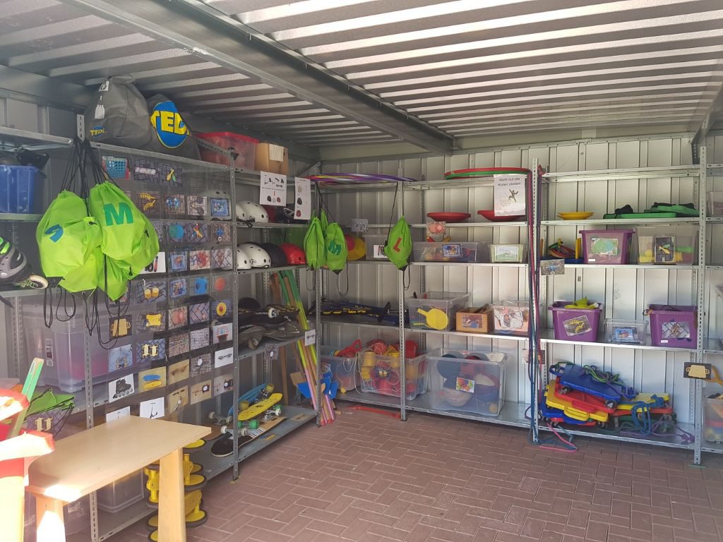 Durch die Abgabe ihres Schülerausweises können sich die Schülerinnen und Schüler verschiedene Spielgeräte wie Bälle und Springseile, Stelzen, Roller und Waveboards, Malkreide, Sandspielzeug und vieles andere ausleihen.