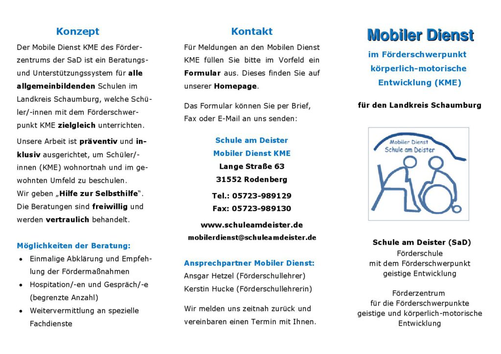 Der Mobile Dienst im Förderschwerpunkt körperlich-motorische Entwicklung (KME) des Förderzentrums der Schule am Deister ist ein Beratungs- und Unterstützungssystem für alle allgemeinbildenden Schulen im Landkreis Schaumburg, welche Schülerinnen und Schüler mit dem Förderschwerpunkt KME zielgleich unterrichten. Unsere Arbeit ist präventiv und inklusiv ausgerichtet, um Schülerinnen und Schüler (KME) wohnortnah und im gewohnten Umfeld zu beschulen. Wir geben „Hilfe zur Selbsthilfe“. Die Beratungen sind freiwillig und werden vertraulich behandelt.